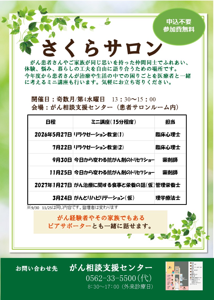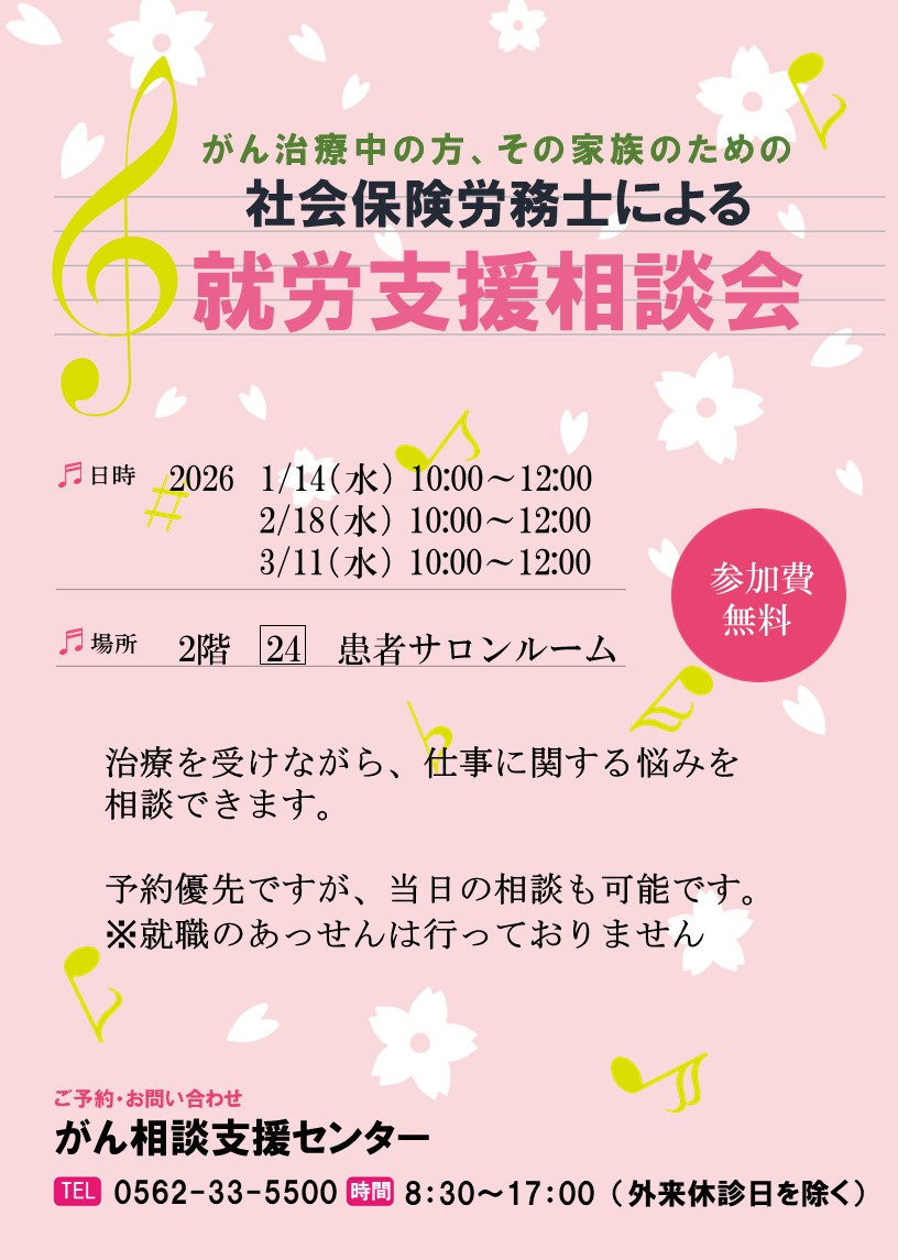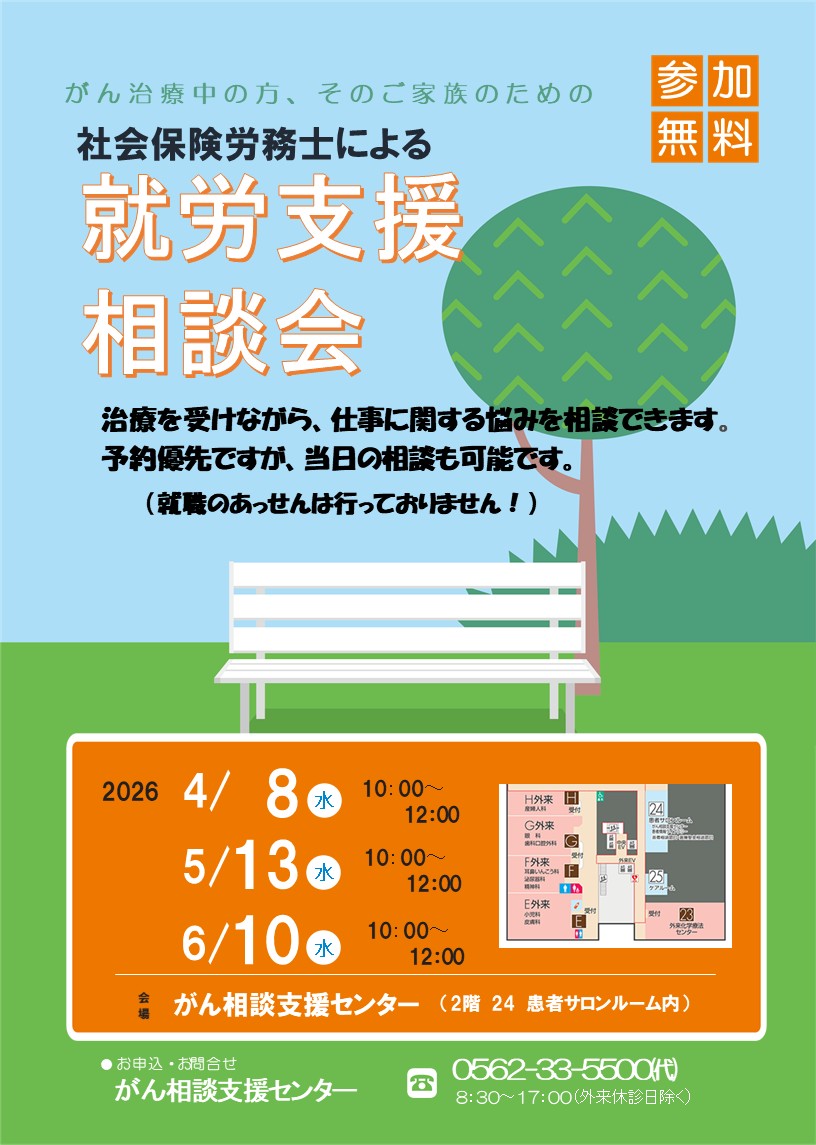 | 相談方法 | 事前にご予約いただいた内容に応じ、専門員が対応させていただきます。 電話番号:0562-33-5500(代表)(内線22051) もしくは「がん相談支援センター受付」にてご予約ください。 |