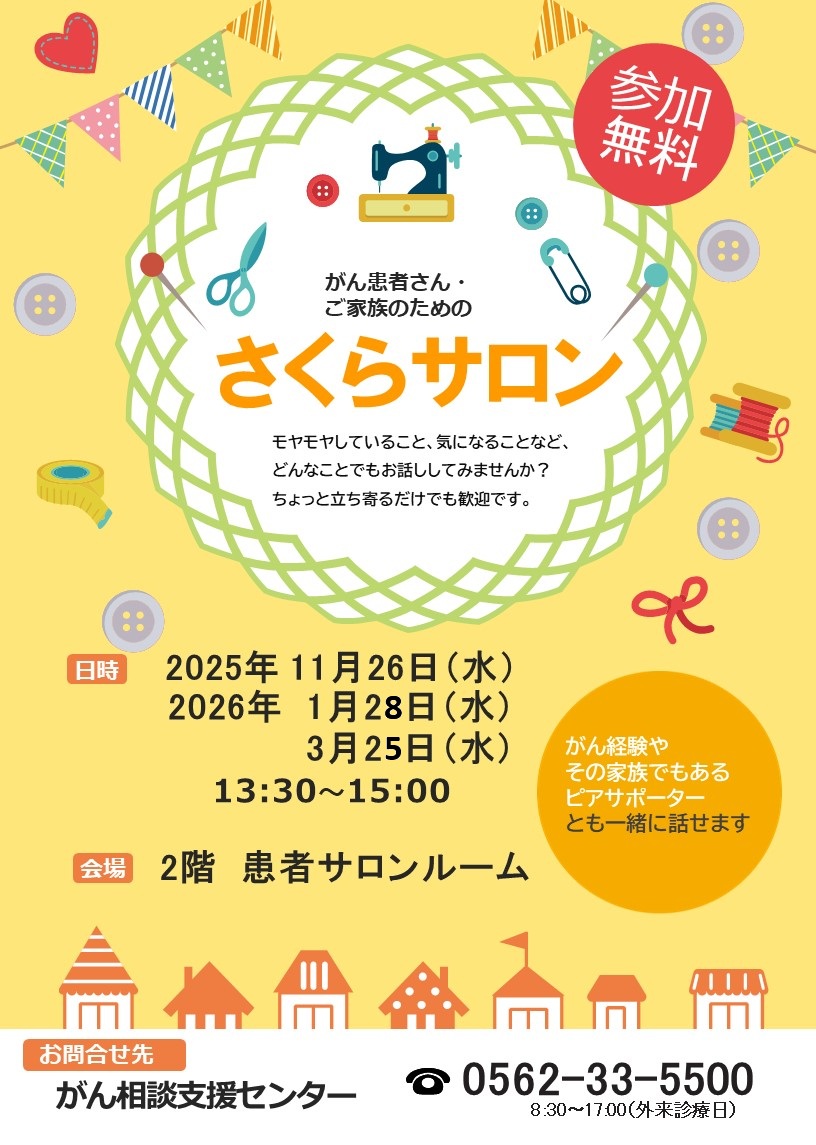 またがんに関する悩みや体験を気軽に語り合う交流の場「さくらサロン」も開催しています。同じような立場の方々と気持ちを共有し不安を語り合うことで、気持ちの整理ができ、心の負担の軽減にもつながります。患者さんご自身やご家族をはじめ、どなたでも参加できます。お気軽にご参加ください。お待ちしています。
